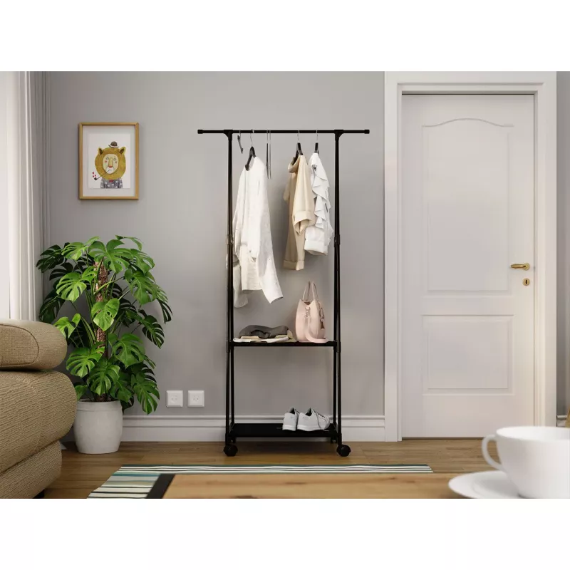 Vešiak je vyrobený z lakovaného kovu. Okrem rámu na vešiaky ponúka dve police z polyesteru. Namontované kolieska uľahčia jeho pohyb.