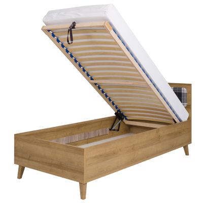 Pohodlná posteľ s plochou na spanie 90x200 cm je vybavená úložným priestorom na posteľnú bielizeň. Posteľ je dodávaná s roštom. Vhodný matrac nájdete v podobnom tovare nižšie.