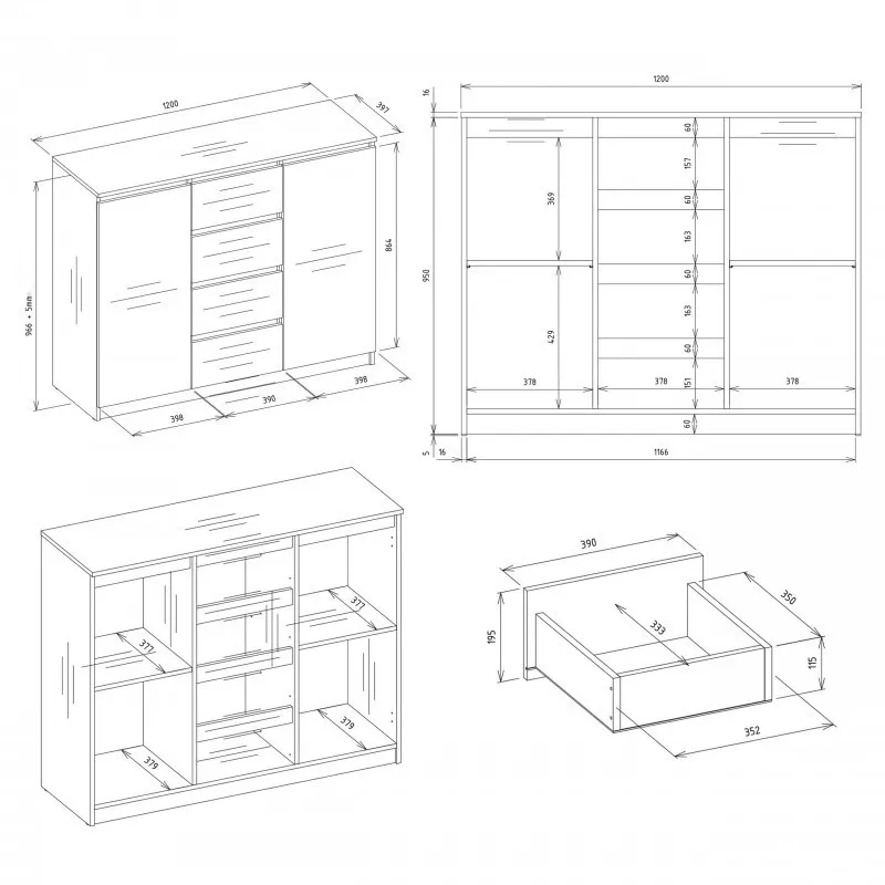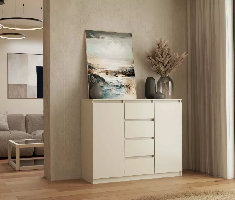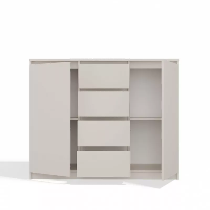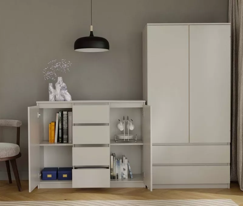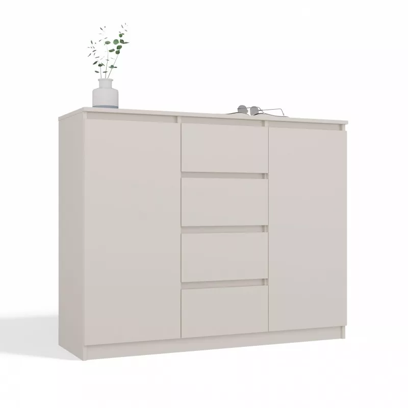 Kombinovaná široká komoda ELBE je funkčná a priestranná komoda, ktorá ozdobí interiér vašej spálne či obývačky. Bezúchytkové čelá šuplíkov a dvierok zaisťujú pohodlné používanie a zdôrazňujú moderný charakter nábytku. Komoda disponuje 2 skrinkami a 4 šuplíkmi, ktoré poskytujú mnoho úložného priestoru.