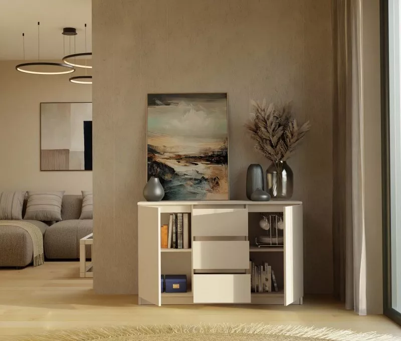 Široká komoda so zásuvkami a dvierkami ELBE je funkčná a priestranná komoda, ktorá ozdobí interiér vašej spálne alebo obývačky. Bezúchytkové čelá šuplíkov a dvierok zaisťujú pohodlné používanie a zdôrazňujú moderný charakter nábytku. Komoda disponuje 2 skrinkami a 3 šuplíkmi, ktoré poskytujú dostatok úložného priestoru.