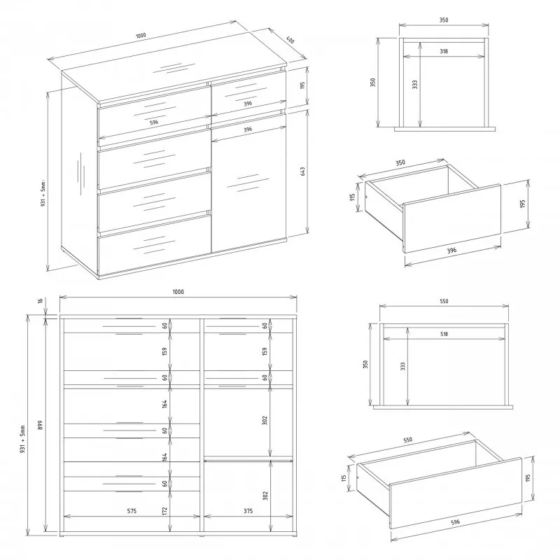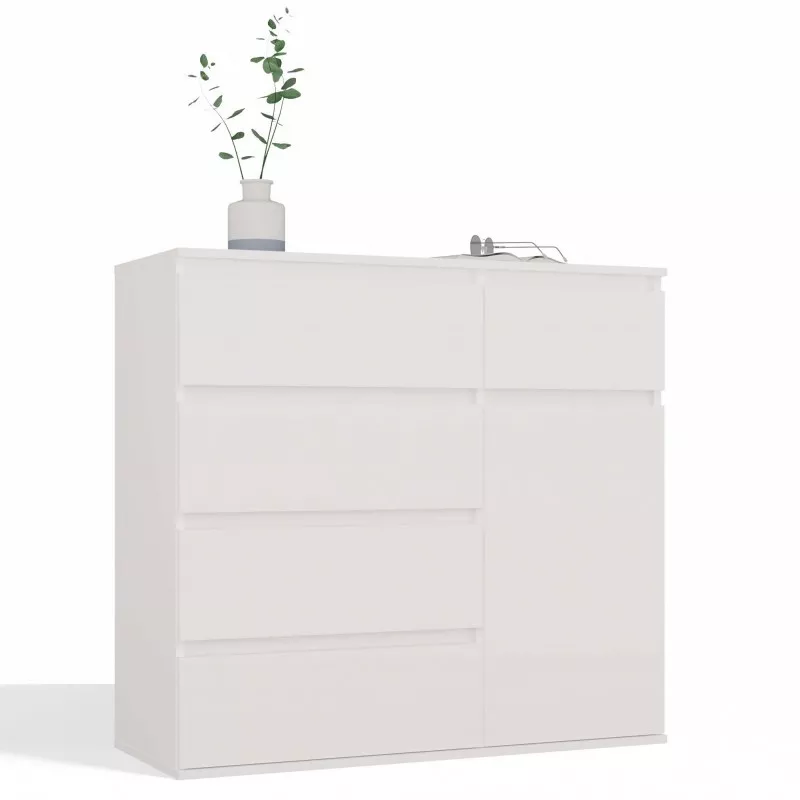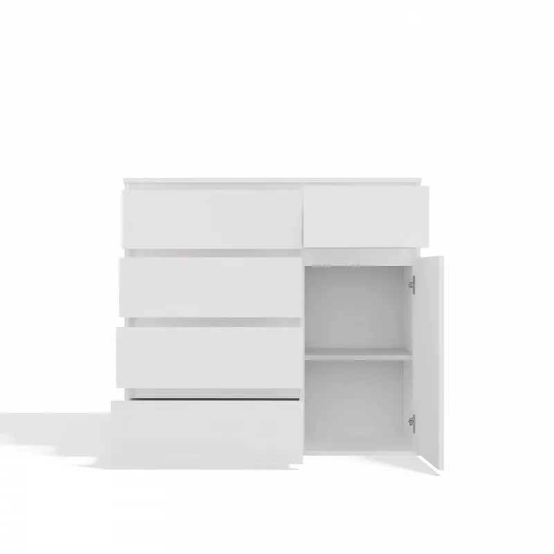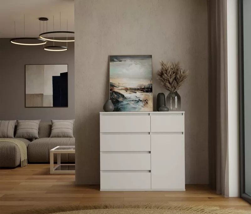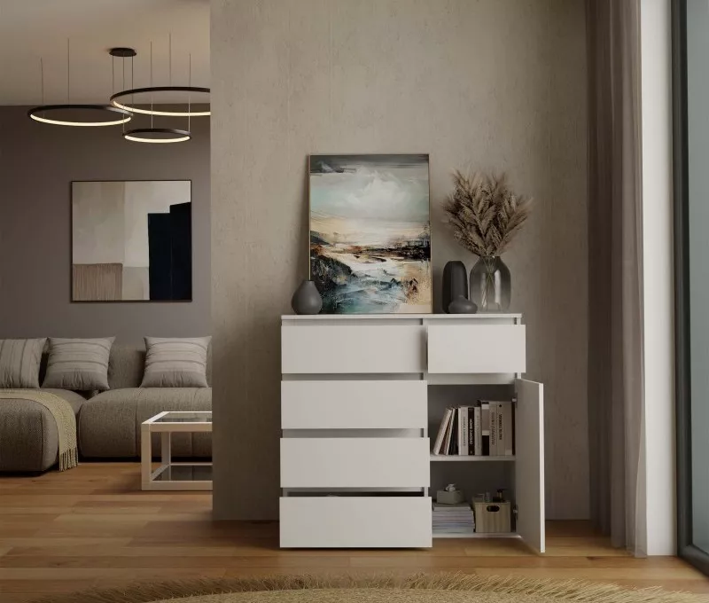 Komoda so šuplíkmi ELBE je funkčná a priestranná komoda, ktorá ozdobí interiér vašej spálne či obývacej izby. Bezúchytkové čelá šuplíkov a dvierok zaisťujú pohodlné používanie a zdôrazňujú moderný charakter nábytku. Komoda disponuje skrinkou s policou a 5 šuplíkmi, ktoré poskytujú dostatočne veľký úložný priestor.