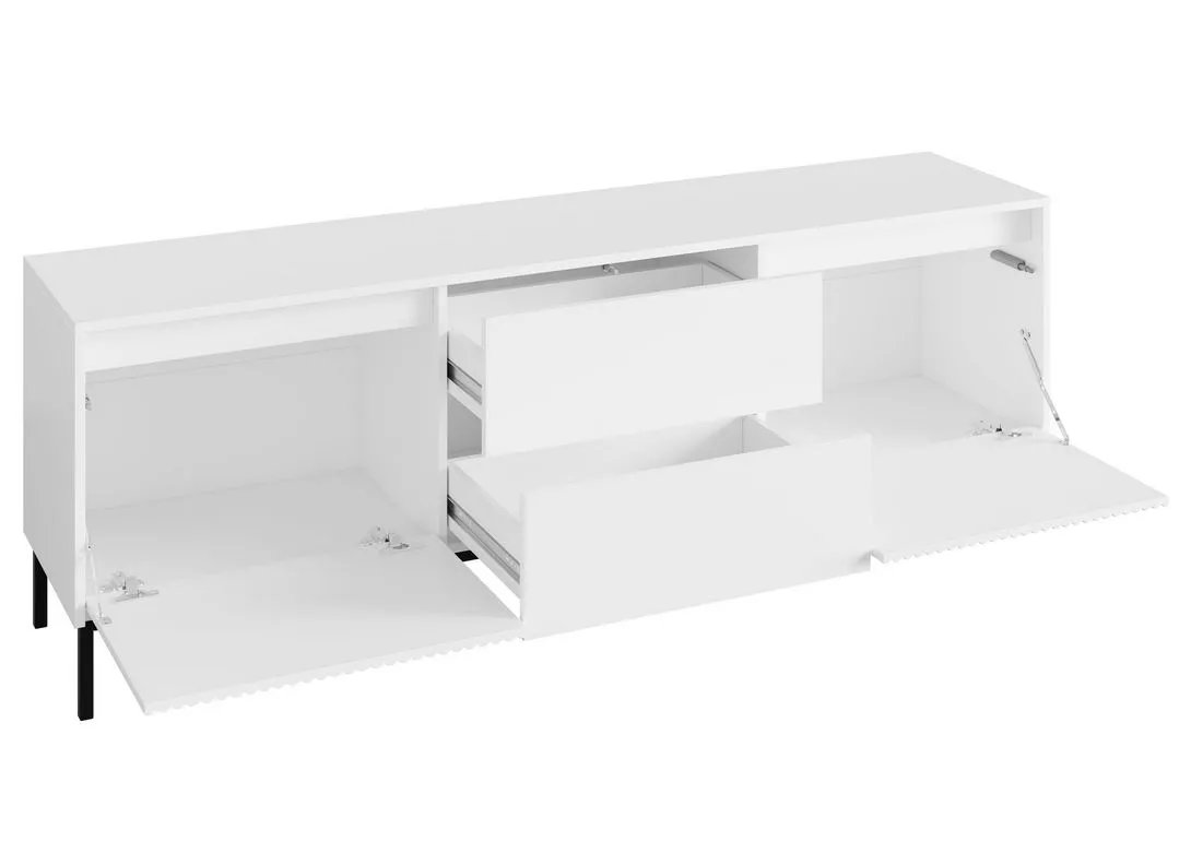 TV stolík REMY 2 je spojením podmanivého vzhľadu s praktickým riešením. Pozoruhodné frézovanie na predných dvierkach spolu s vysokými kovovými nôžkami vytvára mimoriadny vizuálny efekt. Stolík je vybavený 2 skrinkami a zásuvkami na uloženie všetkého televízneho príslušenstva.