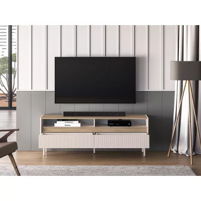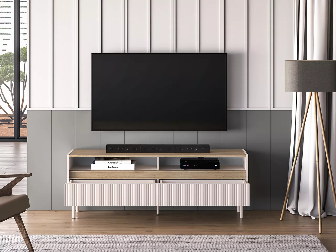 Televízny stolík THEA sa vďaka svojmu dekoru duba a drážkovaným šuplíkom stane hlavným bodom vašej obývačky. Priestranné šuplíky, 2 otvorené priehradky a 2 otvory pre vývod káblov vám pomôžu zorganizovať všetko televízne príslušenstvo.