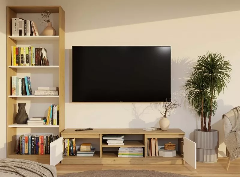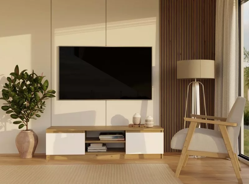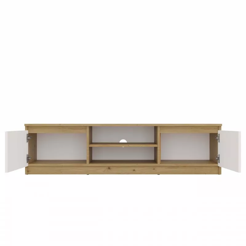 Televízny stolík SABA 2 splní očakávania všetkých, ktorí oceňujú spojenie jednoduchosti a elegancie. Otvorené priehradky a 2 skrinky poskytujú dostatok miesta na uloženie TV príslušenstva. Stolík disponuje aj otvorom na vývod káblov.