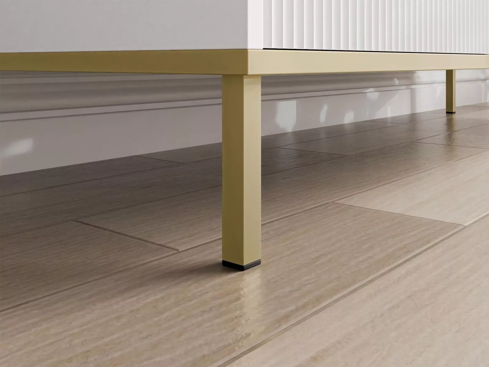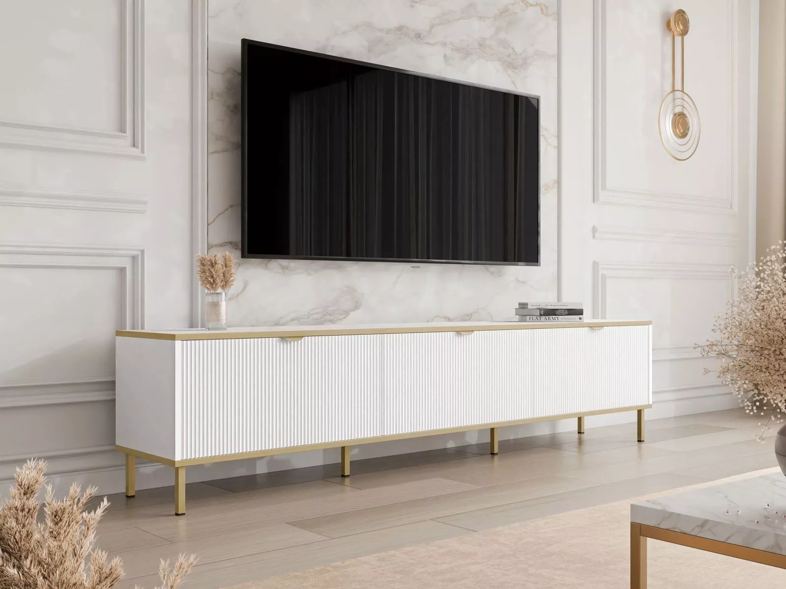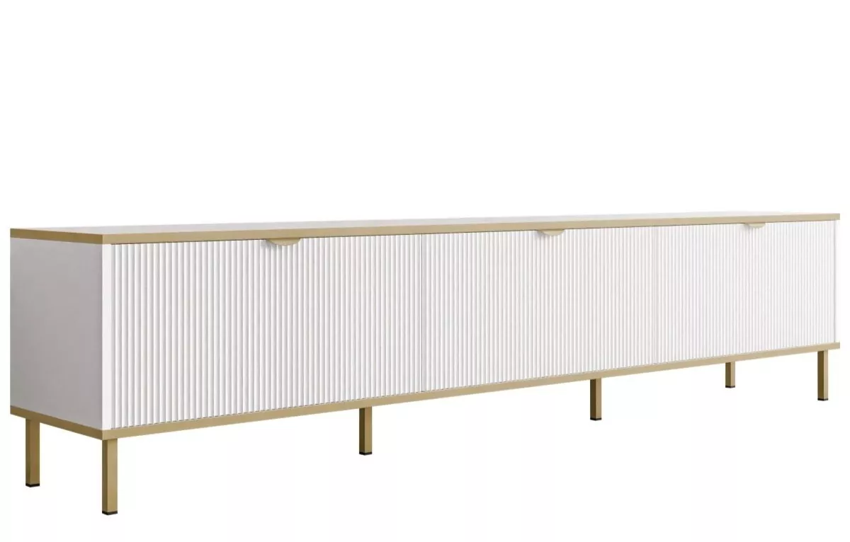 Doprajte si eleganciu a poriadok s televíznym stolíkom PULLMAN, ktorý spája štýl a praktickosť v jednom. Dlhá horná doska zaistí stabilné miesto pre televízor, zatiaľ čo uzavreté skrinky skryjú všetko príslušenstvo aj káble. Premyslené členenie ponúka dostatok priestoru pre konzoly, prehrávače aj ďalšiu techniku. Vertikálne drážkované dvierka a zlaté detaily vnesú do interiéru dotyk luxusu.