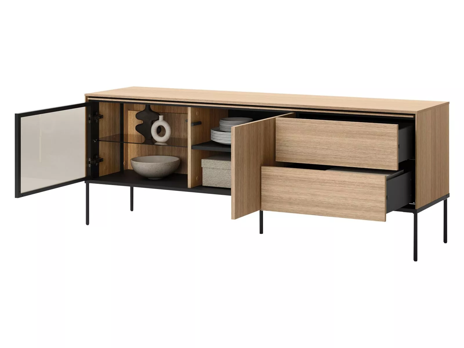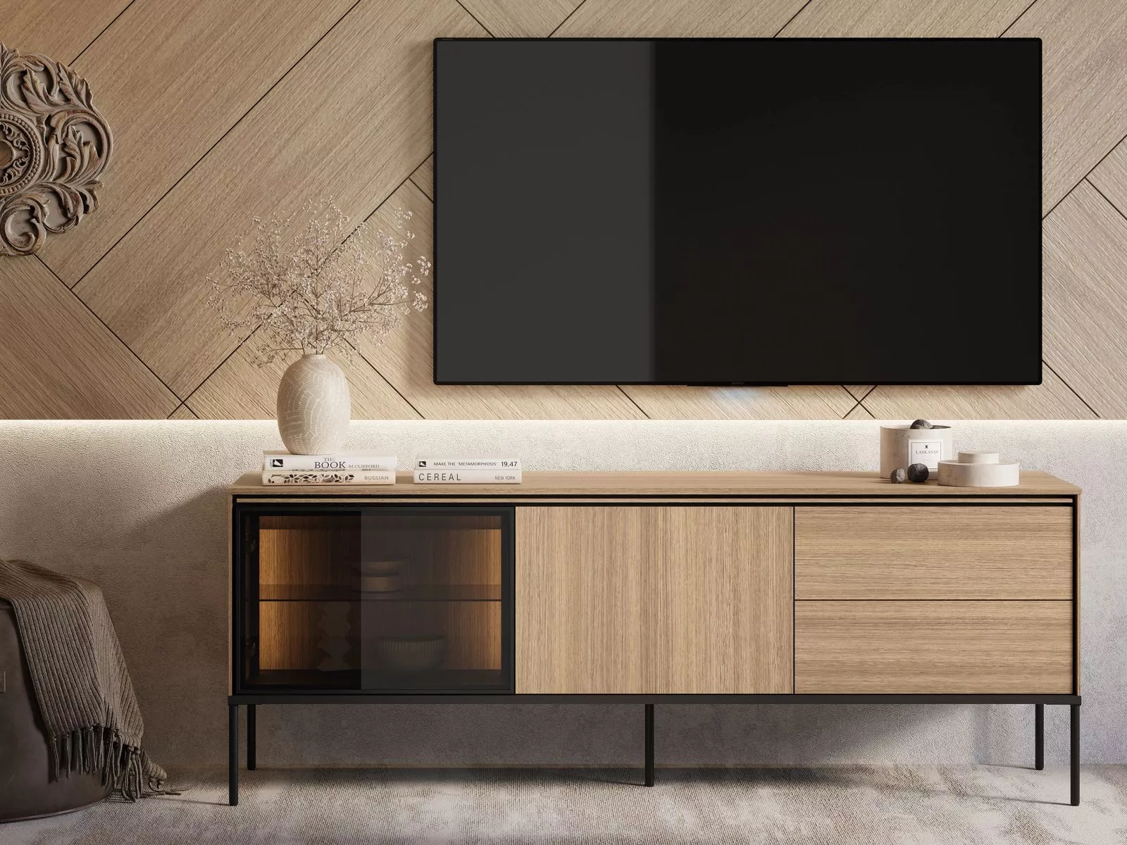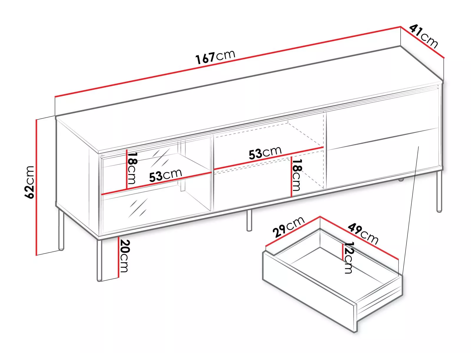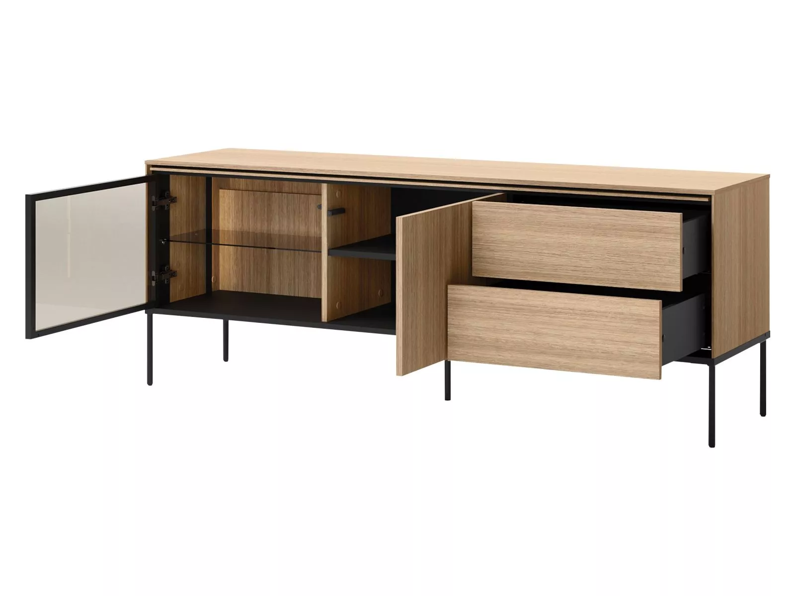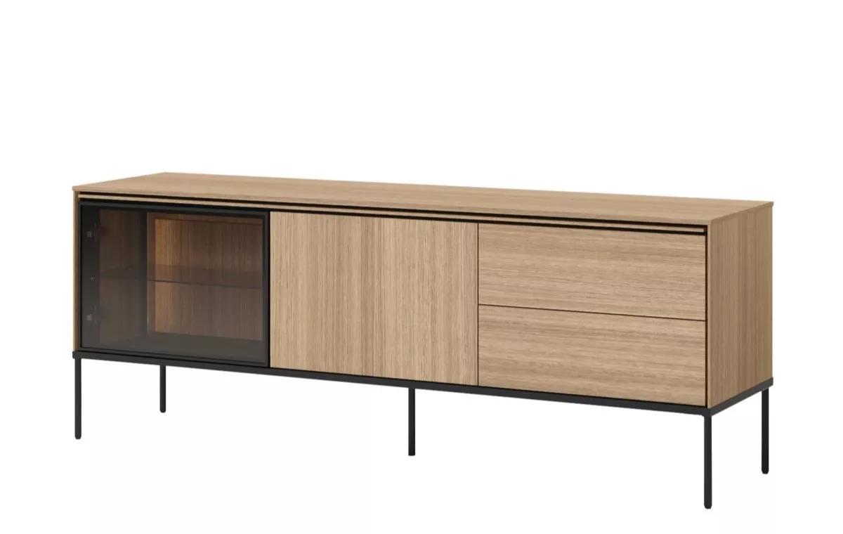 Zaobstarajte si televízny stolík ANACORTES, ktorý zaujme modernou konštrukciou a premysleným úložným priestorom. Presklená skrinka s LED osvetlením, 2 šuplíky a uzavretá skrinka poskytnú miesto na všetko potrebné. Vysoké kovové nohy zaistia stabilitu a pohodlné čistenie podlahy. Elegantné farebné prevedenie dodá interiéru nádych moderného luxusu.