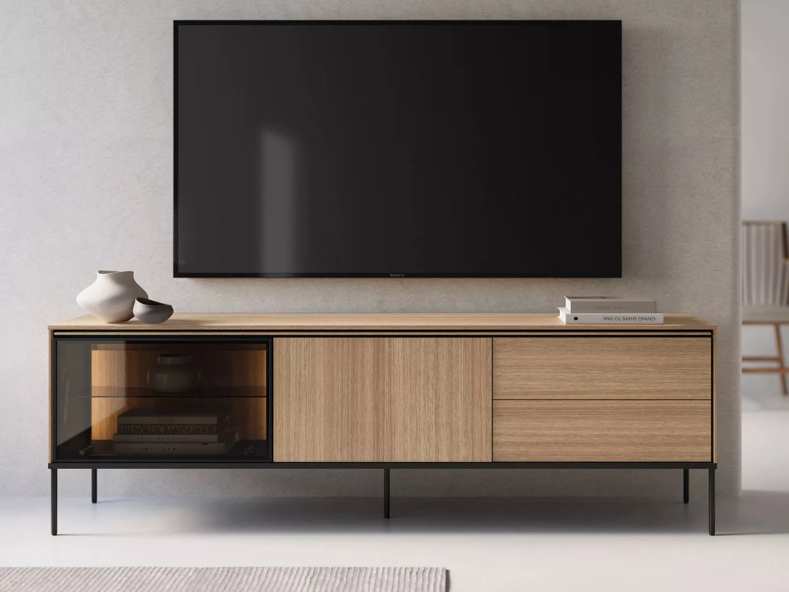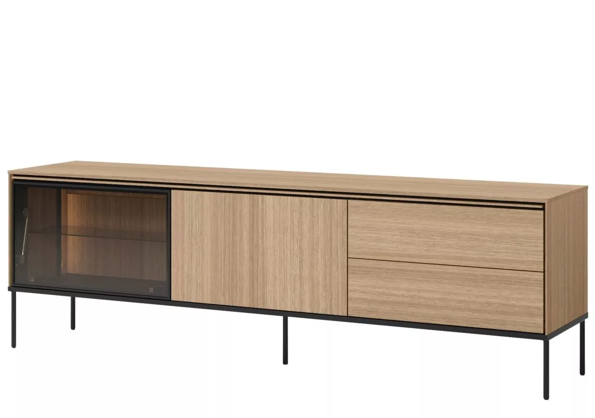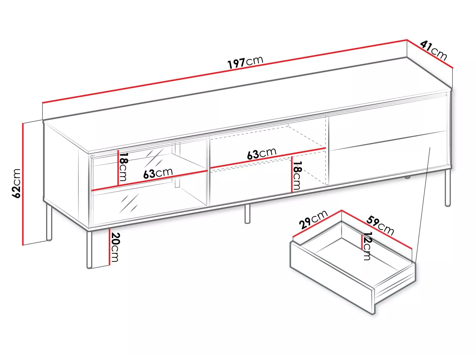 Zaobstarajte si televízny stolík ANACORTES, ktorý zaujme modernou konštrukciou a premysleným úložným priestorom. Presklená skrinka s LED osvetlením, 2 šuplíky a uzavretá skrinka poskytnú miesto na všetko potrebné. Vysoké kovové nohy zaistia stabilitu a pohodlné čistenie podlahy. Elegantné farebné prevedenie dodá interiéru nádych moderného luxusu.