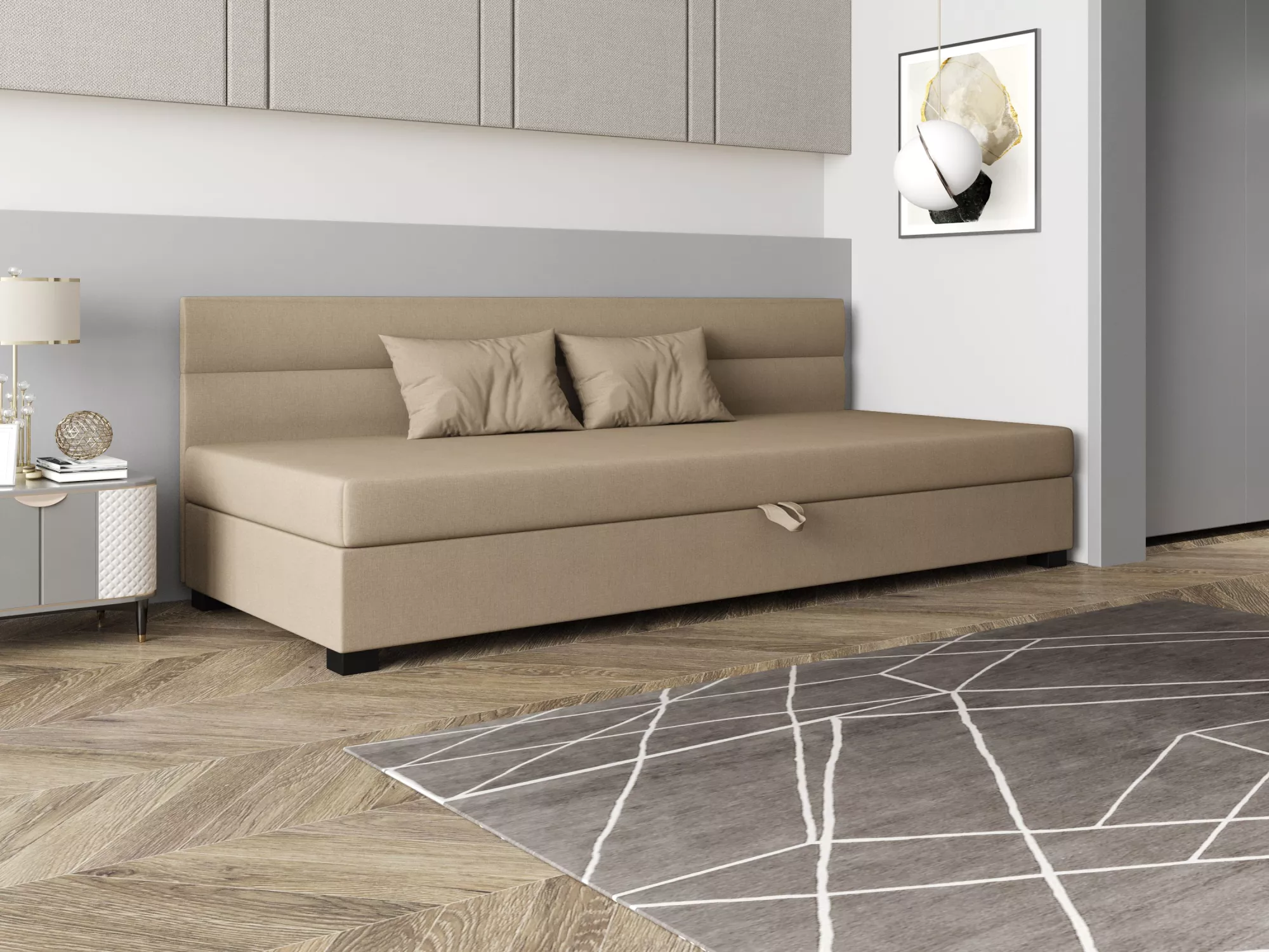 Jednolôžková čalúnená posteľ 120x195 NALINDA BIZ 2 disponuje priestranným úložným priestorom na uloženie posteľnej bielizne alebo sezónneho oblečenia. Vysoké čalúnené čelo spríjemní každú chvíľu odpočinku a zabráni poškriabaniu a zašpineniu steny.