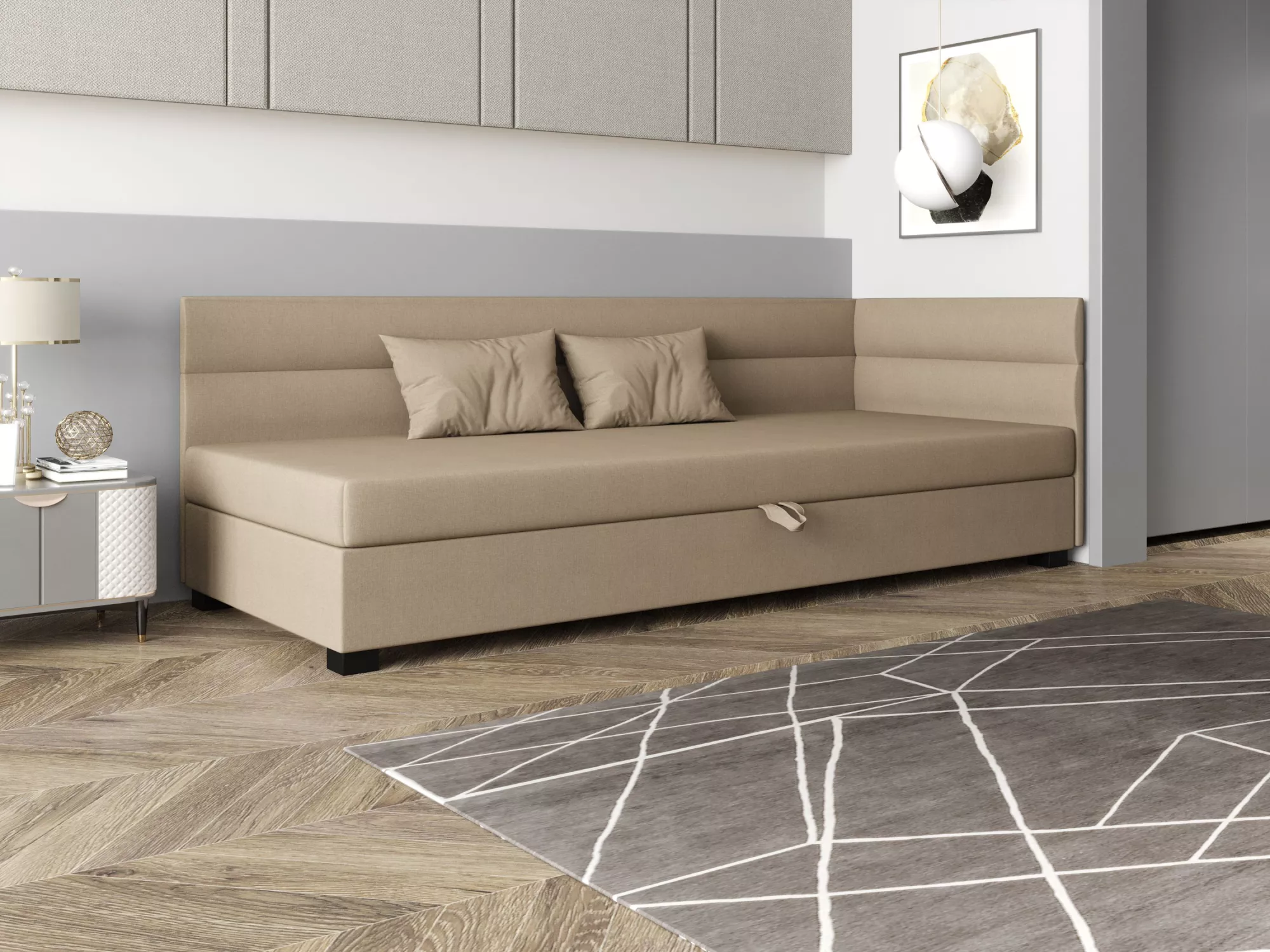 Jednolôžková čalúnená posteľ 100x195 NALINDA PLUS 2 disponuje priestranným úložným priestorom na uloženie posteľnej bielizne alebo sezónneho oblečenia. Vysoké čalúnené čelo spríjemní každú chvíľu odpočinku a zabráni poškriabaniu a zašpineniu steny.