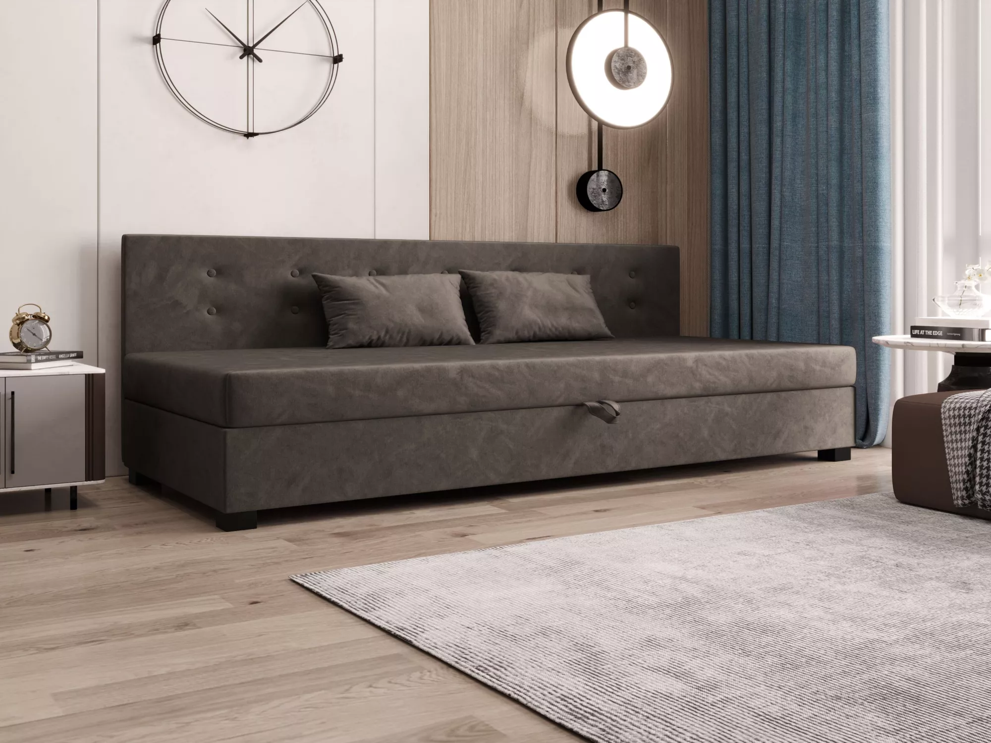 Jednolôžková posteľ 90x195 AJKA BIZ 2 na prvý pohľad zaujme svojím vysokým prešívaným čelom, ktoré zabraňuje poškriabaniu a zašpineniu steny. Posteľ skvele zapadne do každej študentskej izby. Nechýba ani praktický úložný priestor na uloženie lôžkovín alebo sezónneho oblečenia.