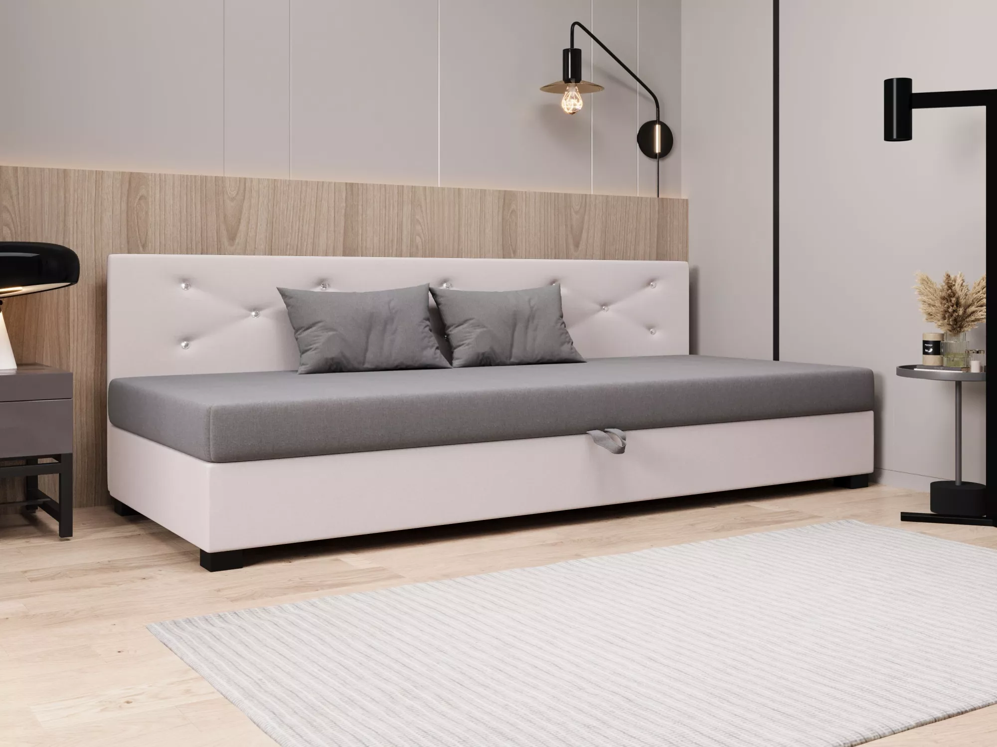 Čalúnená posteľ 110x195 MILEKA BIZ 1 zaujme predovšetkým svojím prešívaným čelom s ozdobnými gombíkmi. Pohodlný matrac poskytne všetok komfort pre odpočinok a relaxáciu. Posteľ disponuje priestranným úložným priestorom, kde môžete schovať lôžkoviny alebo sezónne oblečenie.