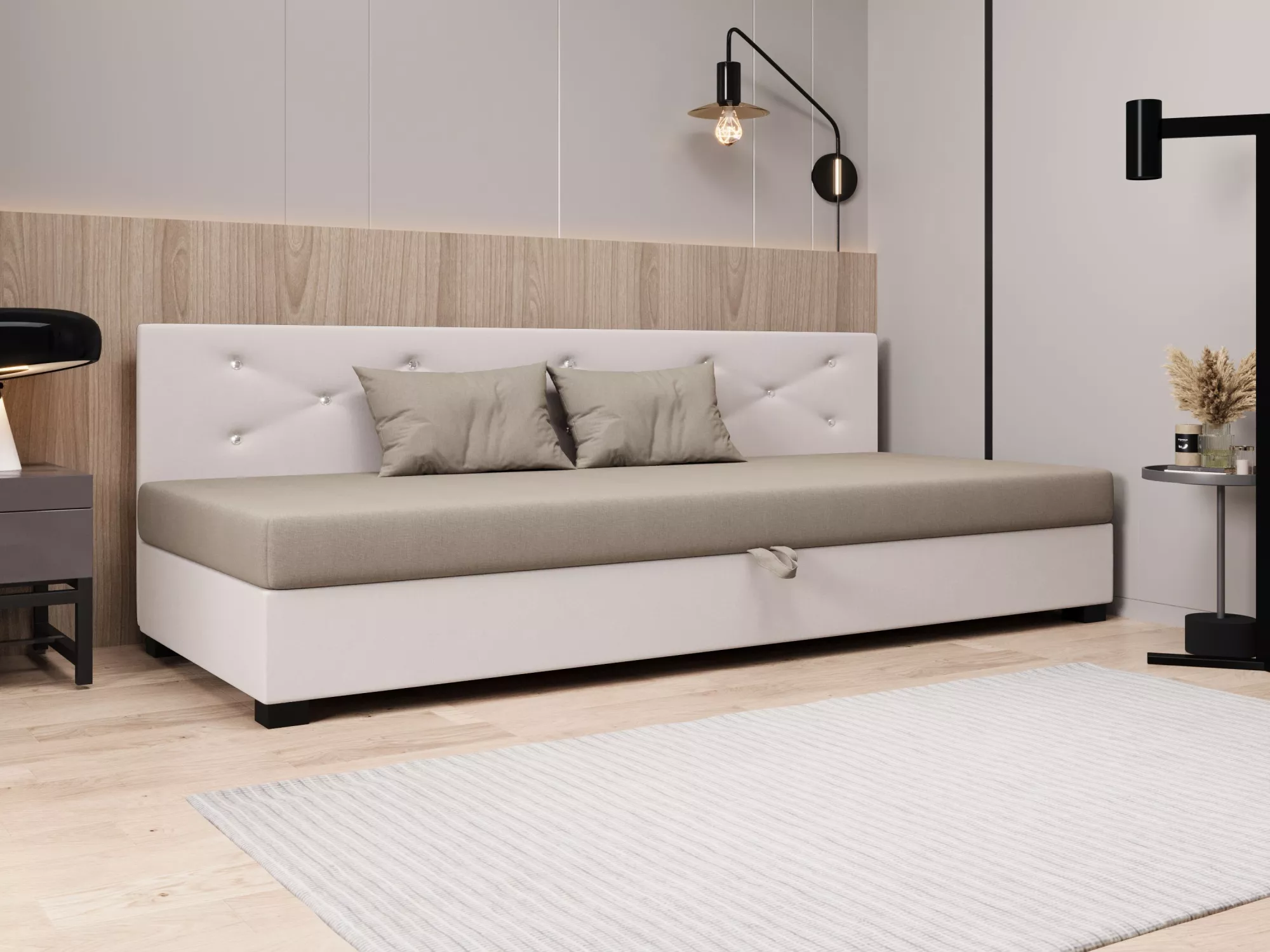 Čalúnená posteľ 120x195 MILEKA BIZ 1 zaujme predovšetkým svojím prešívaným čelom s ozdobnými gombíkmi. Pohodlný matrac poskytne všetok komfort pre odpočinok a relaxáciu. Posteľ disponuje priestranným úložným priestorom, kde môžete schovať lôžkoviny alebo sezónne oblečenie.