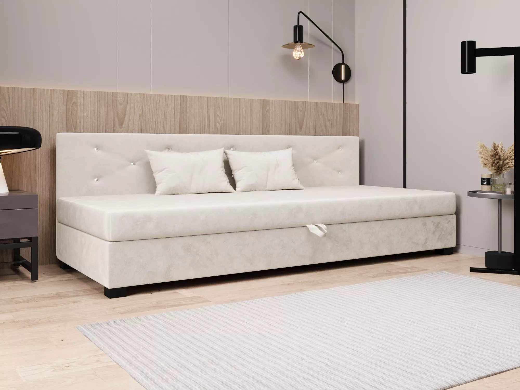 Čalúnená posteľ 100x195 MILEKA BIZ 1 zaujme predovšetkým svojím prešívaným čelom s ozdobnými gombíkmi. Pohodlný matrac poskytne všetok komfort pre odpočinok a relaxáciu. Posteľ disponuje priestranným úložným priestorom, kde môžete schovať lôžkoviny alebo sezónne oblečenie.