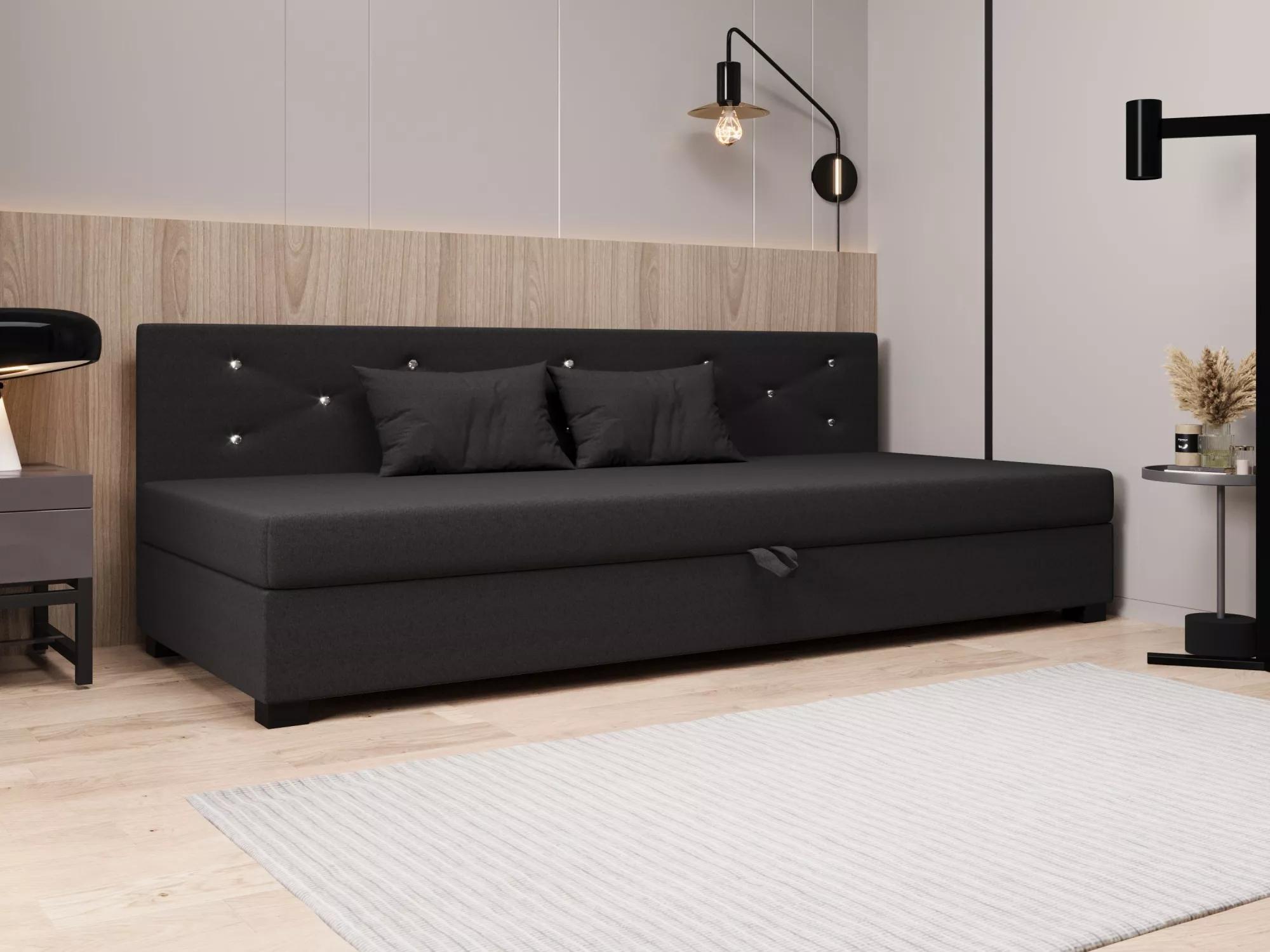 Čalúnená posteľ 100x195 MILEKA BIZ 2 zaujme predovšetkým svojím prešívaným čelom s ozdobnými gombíkmi. Pohodlný matrac poskytne všetok komfort pre odpočinok a relaxáciu. Posteľ disponuje priestorným úložným priestorom, kde môžete schovať lôžkoviny alebo sezónne oblečenie.
