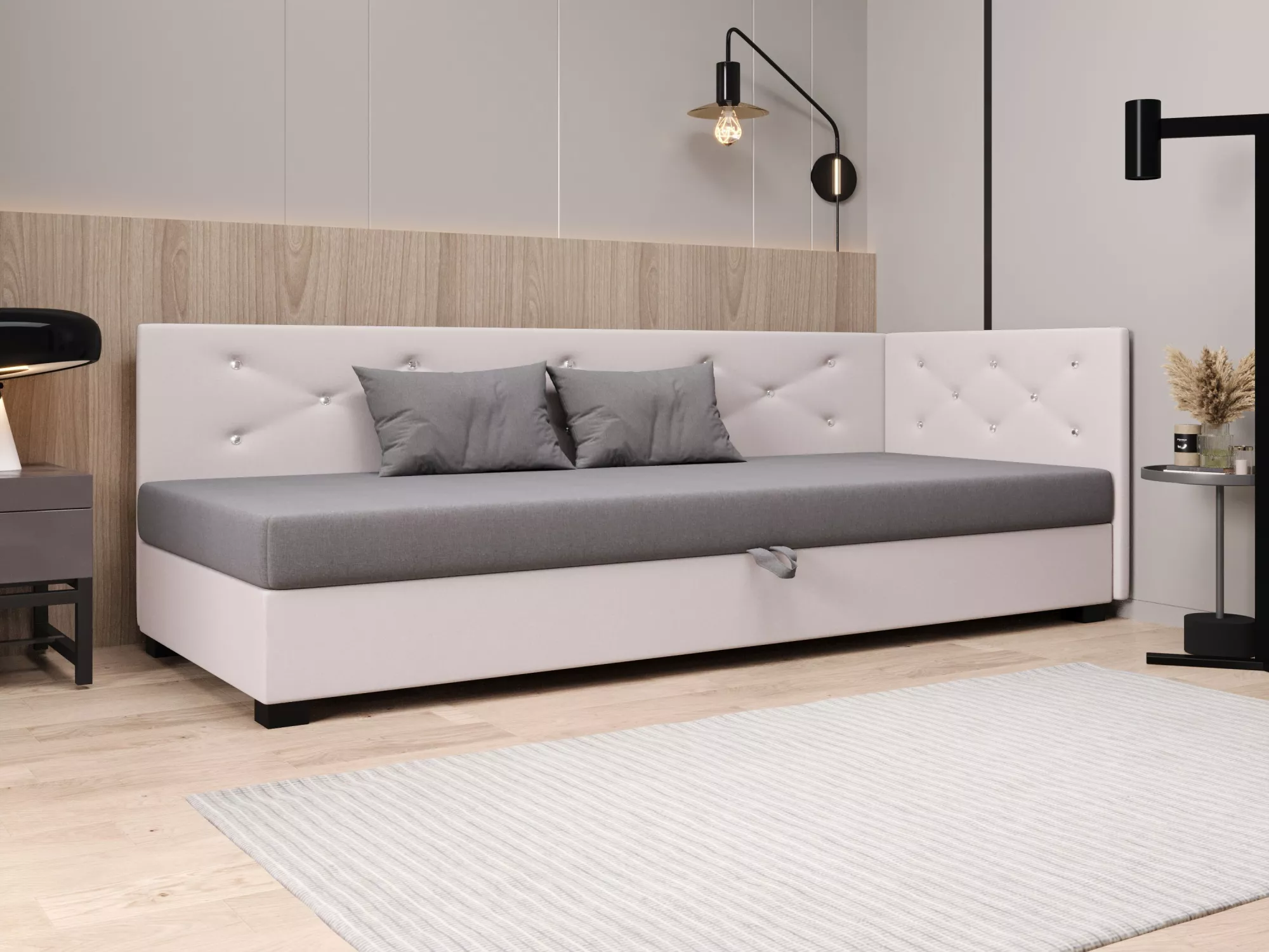Čalúnená posteľ 110x195 MILEKA PLUS 1 zaujme predovšetkým svojím prešívaným čelom s ozdobnými gombíkmi. Pohodlný matrac poskytne všetok komfort pre odpočinok a relaxáciu. Posteľ disponuje priestranným úložným priestorom, kde môžete schovať lôžkoviny alebo sezónne oblečenie.