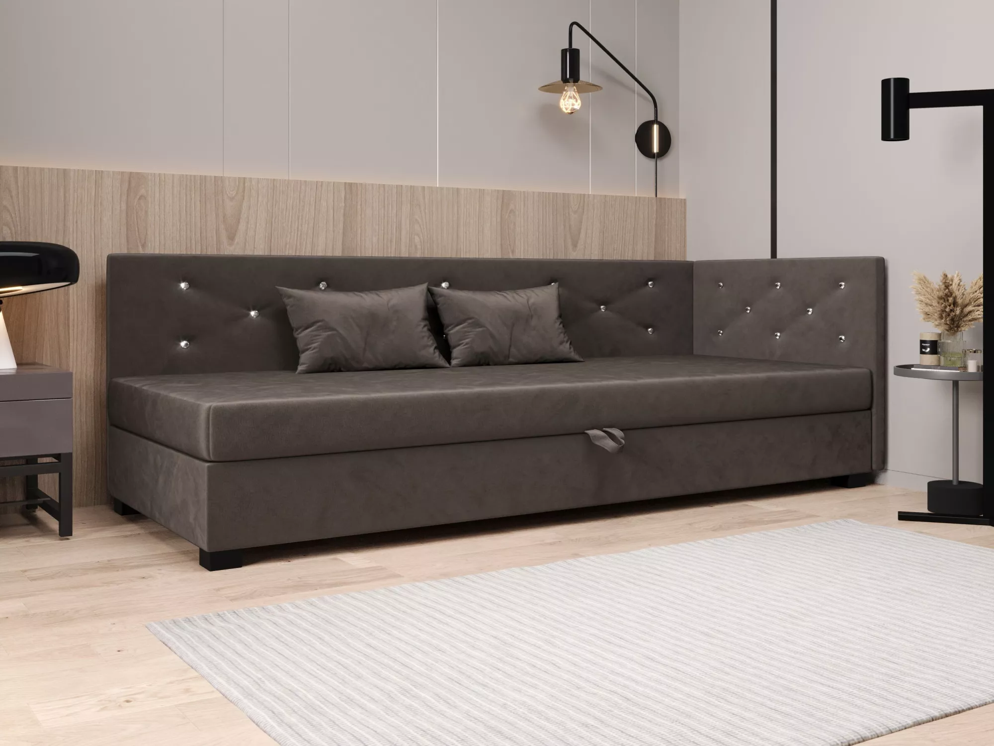 Čalúnená posteľ 90x195 MILEKA PLUS 1 zaujme predovšetkým svojím prešívaným čelom s ozdobnými gombíkmi. Pohodlný matrac poskytne všetok komfort pre odpočinok a relaxáciu. Posteľ disponuje priestorným úložným priestorom, kde môžete schovať lôžkoviny alebo sezónne oblečenie.