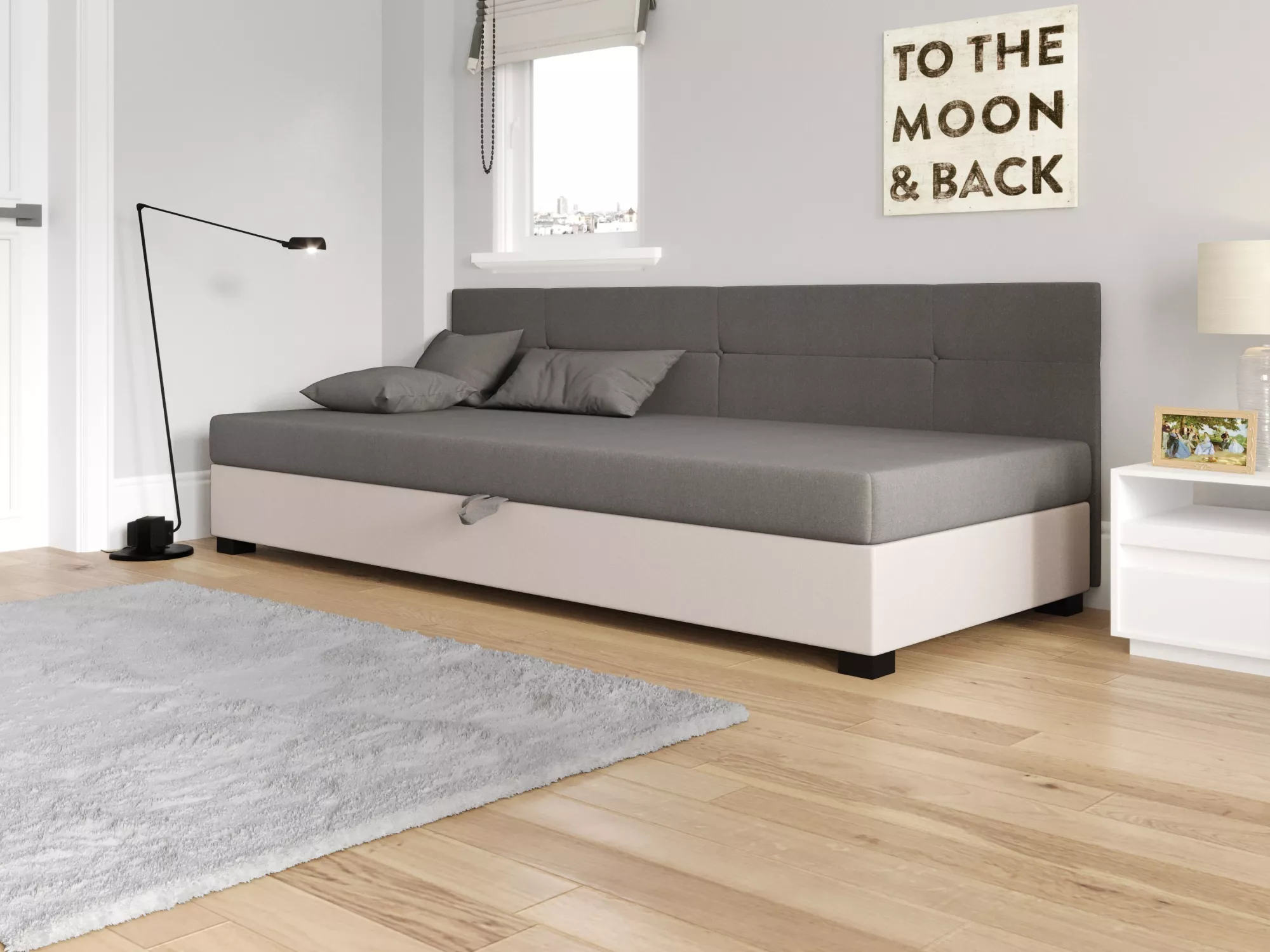 Súčasťou postele je zabudovaný matrac a úložný priestor.