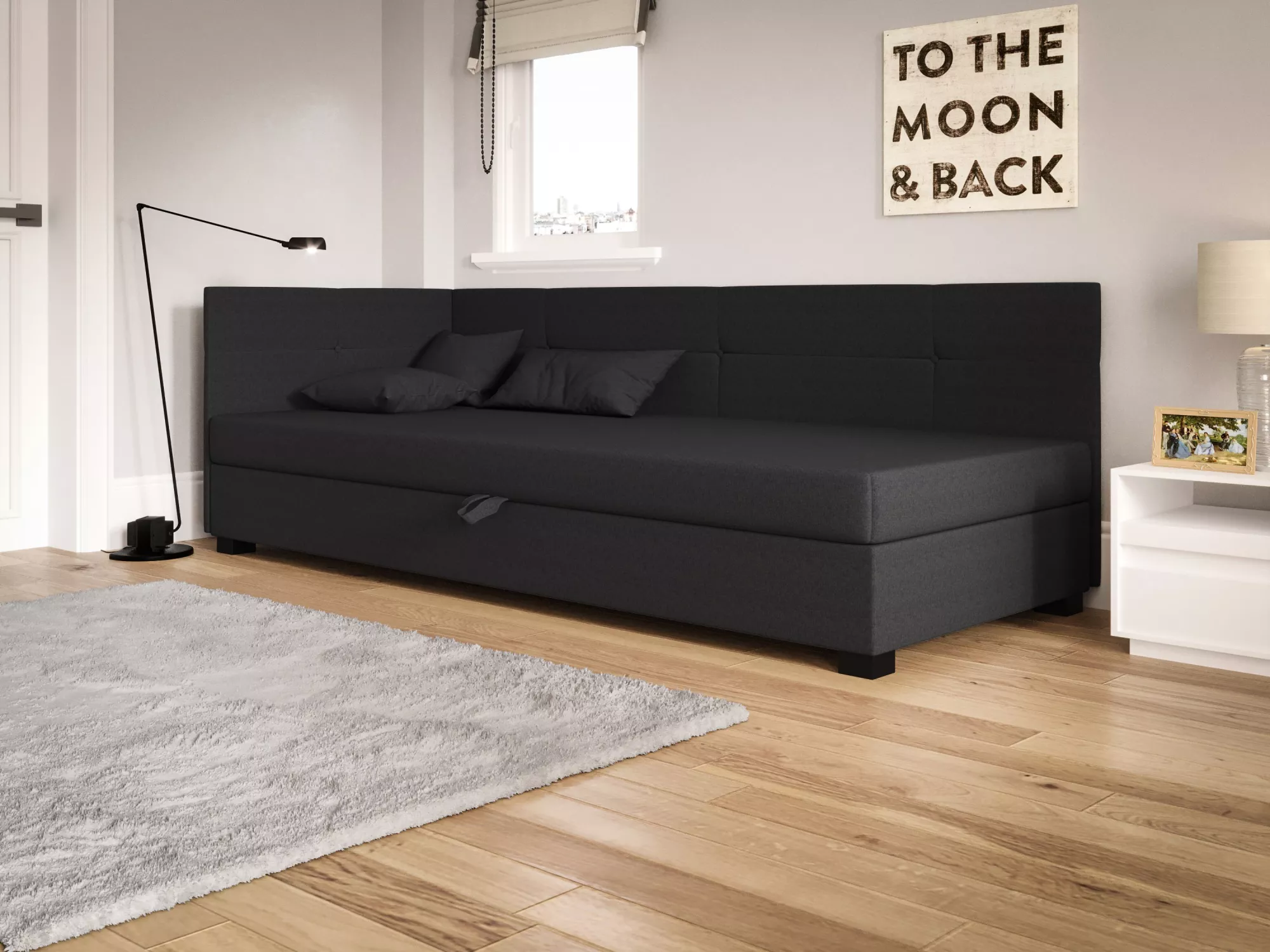 Súčasťou postele je zabudovaný matrac a úložný priestor.